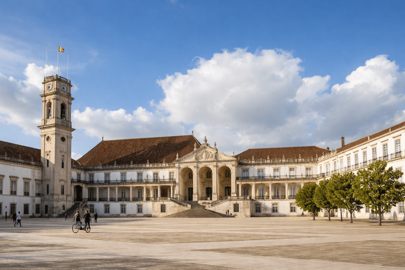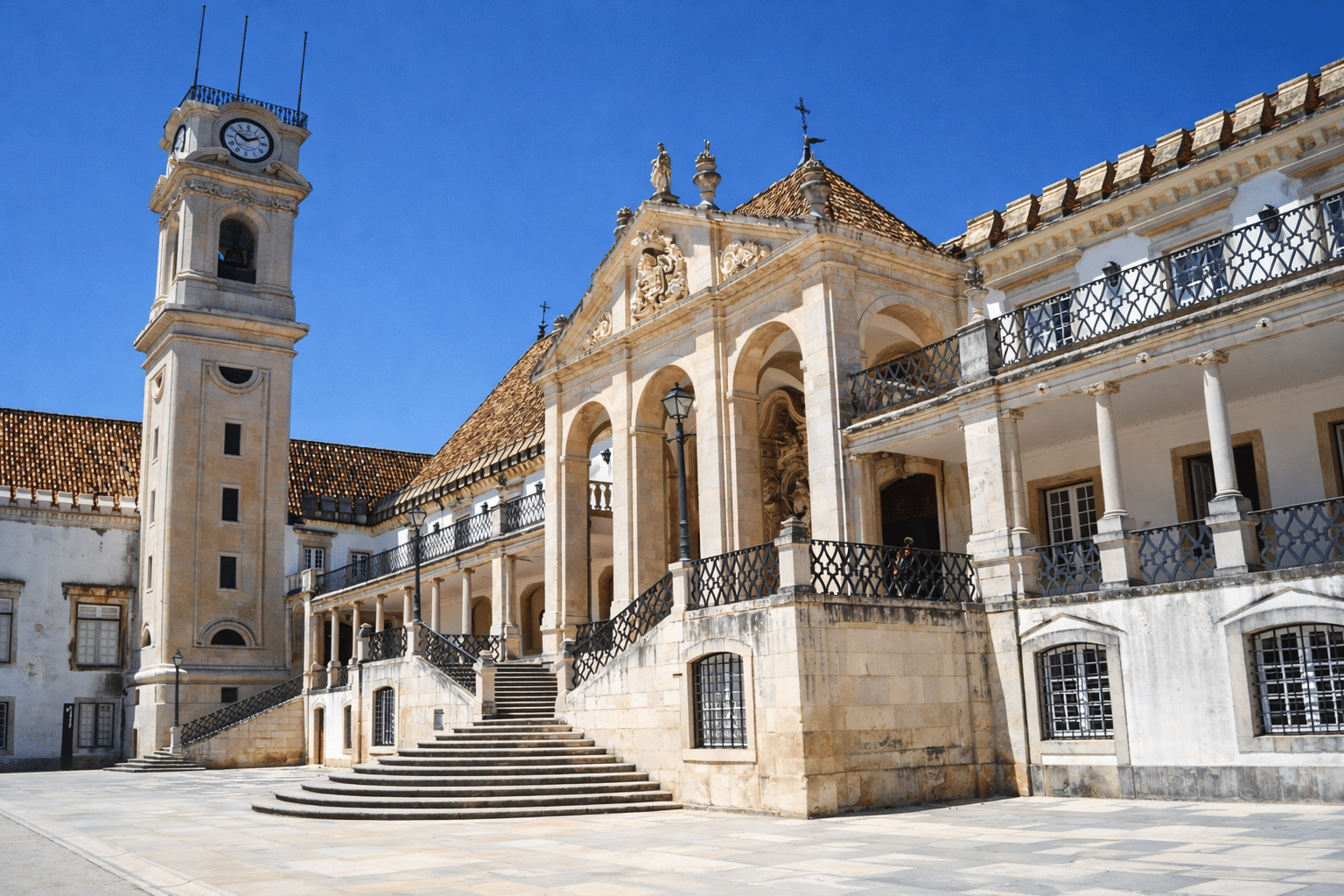 O histórico Paço das Escolas da Universidade de Coimbra destaca fachadas neoclássicas e a icónica torre do relógio.