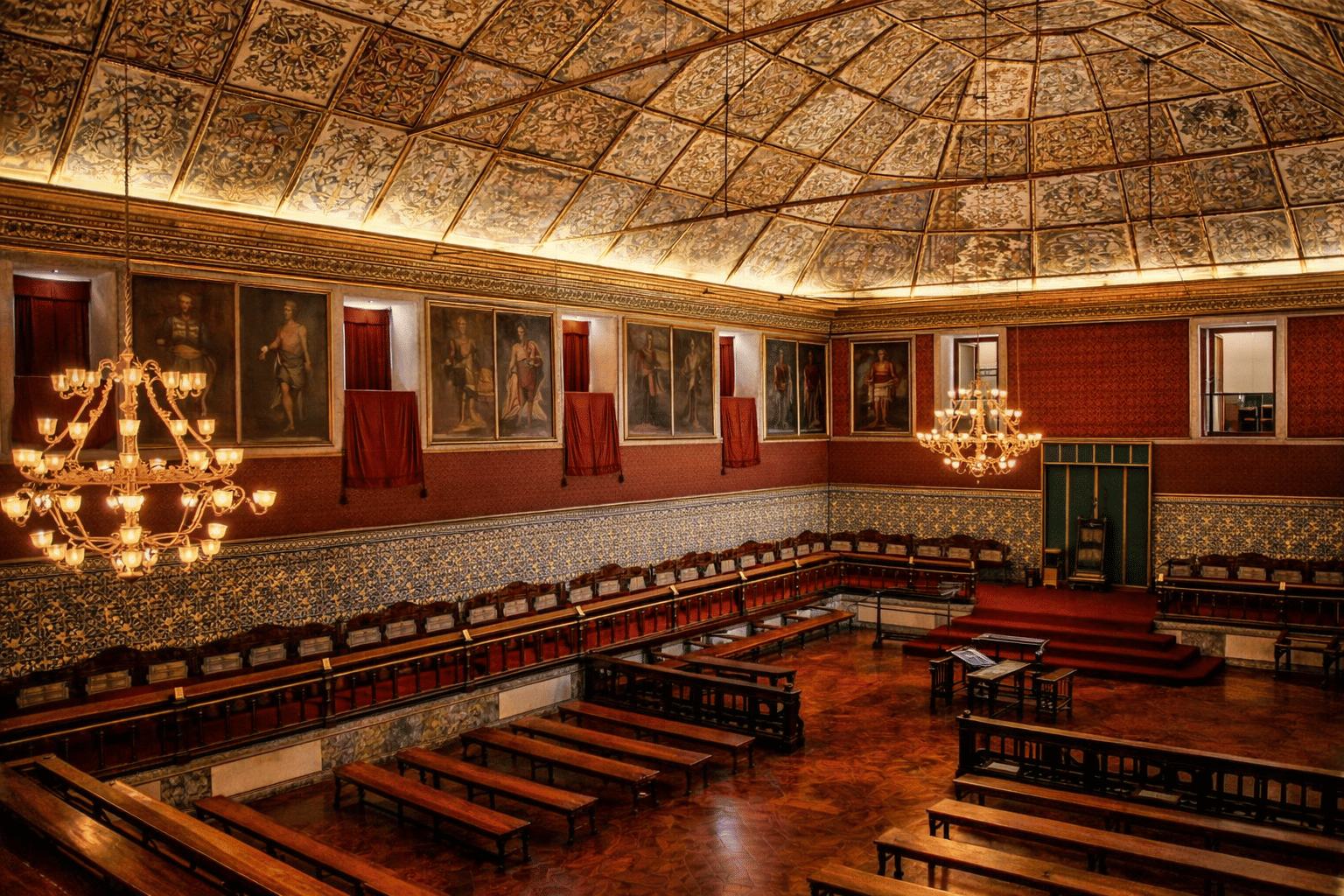 A histórica Sala dos Capelos da Universidade de Coimbra destaca-se pelos azulejos, retratos régios e teto ricamente pintado.