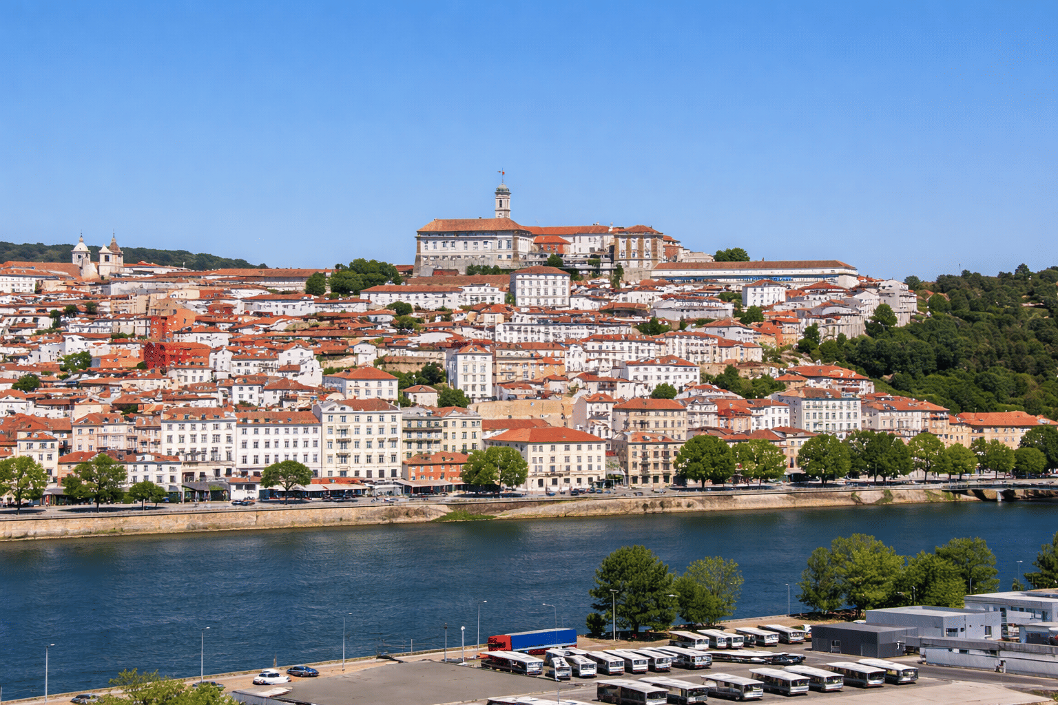 Uma vista panorâmica de Coimbra eleva-se sobre o rio Mondego, com telhados vermelhos e a universidade histórica no topo da colina.
