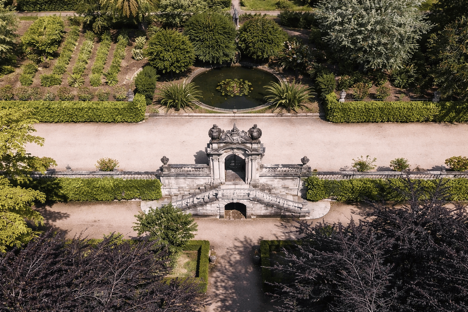 Uma vista aérea destaca a entrada monumental do Jardim Botânico de Coimbra, com portal barroco e caminhos simétricos.