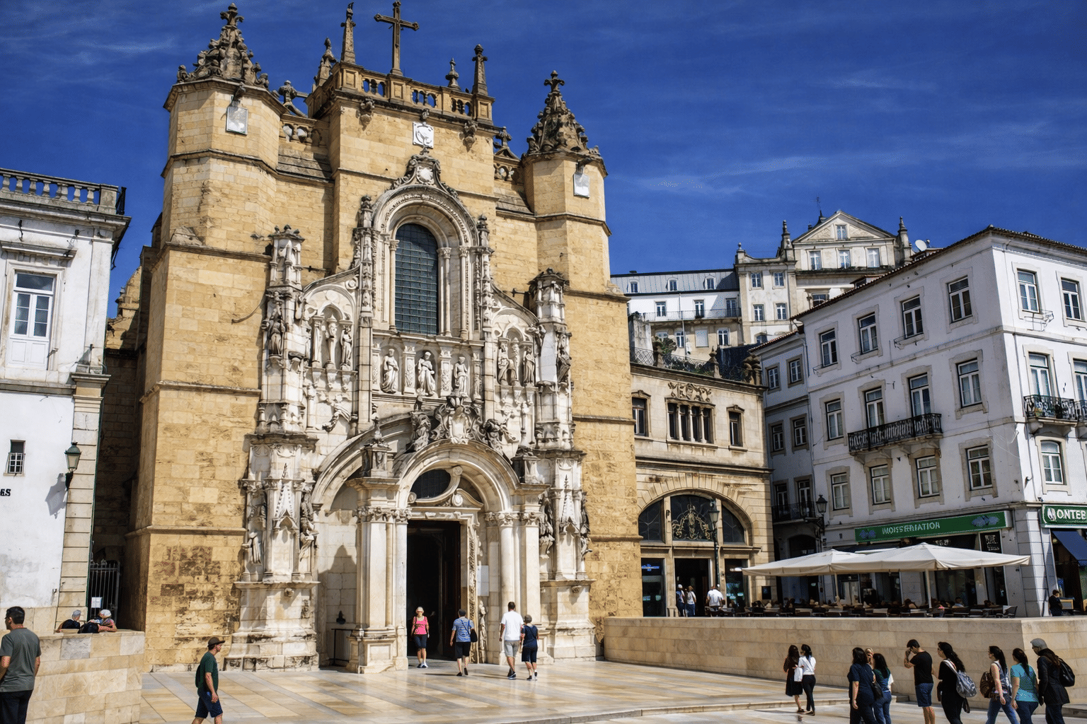 A fachada ricamente esculpida da Igreja de Santa Cruz, em Coimbra, revela influências manuelinas e renascentistas.