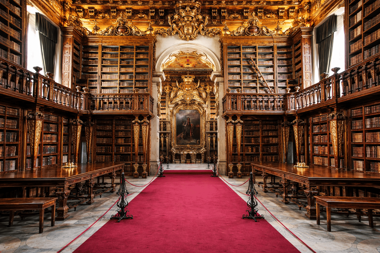 O interior ricamente ornamentado da Biblioteca Joanina, em Coimbra, destaca talha dourada, estantes históricas e arte barroca.